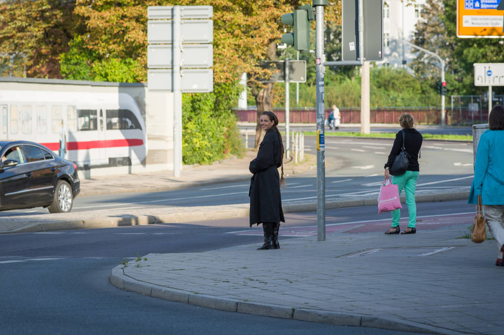 Perfect feminine attire for a city walk but the photographer should have been much closer!
