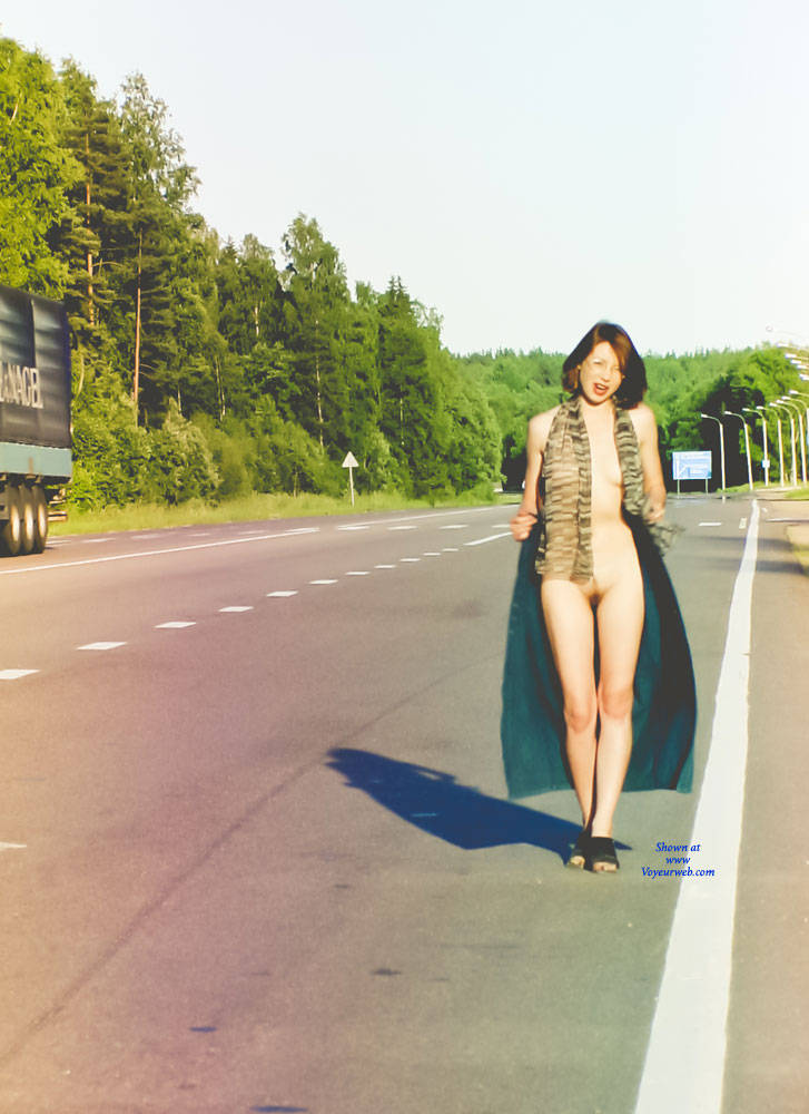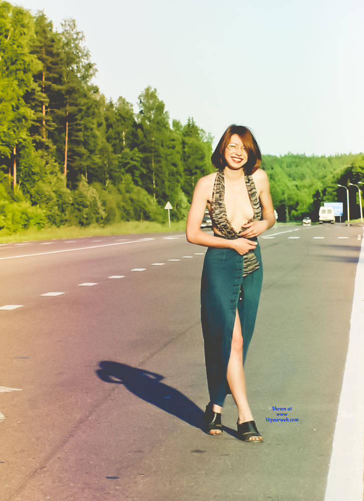 At one nice summer day July start undressing on highway road and show her hot nude body to truck drivers. This is his first nude in public experience and she is little shy.