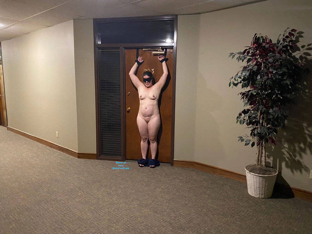 Camille naked and secured to a public trail sign blindfolded so people can take photos of her naked body..