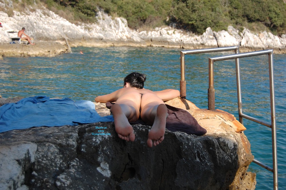 She was sunbathing and swimming in a nearly deserted bay. I just lay next to her, where I can make perfect pics of her gorgeous bikini-body!!! Finally she drop her bikini bottom also to undressing...wow!!!