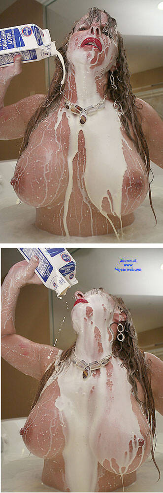 Floating in a milk bath she added some heavy cream on her breasts for even smoother and silkier skin.