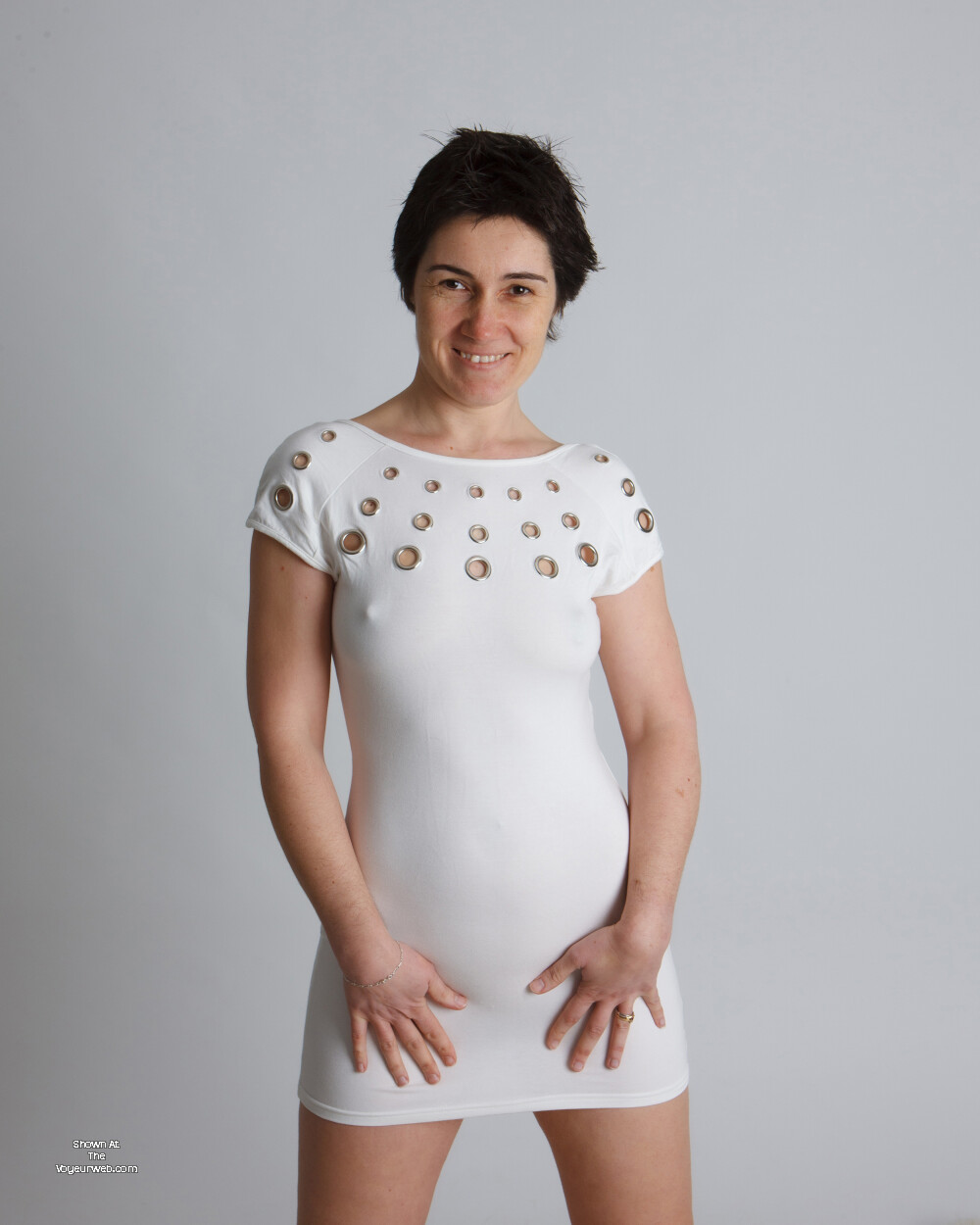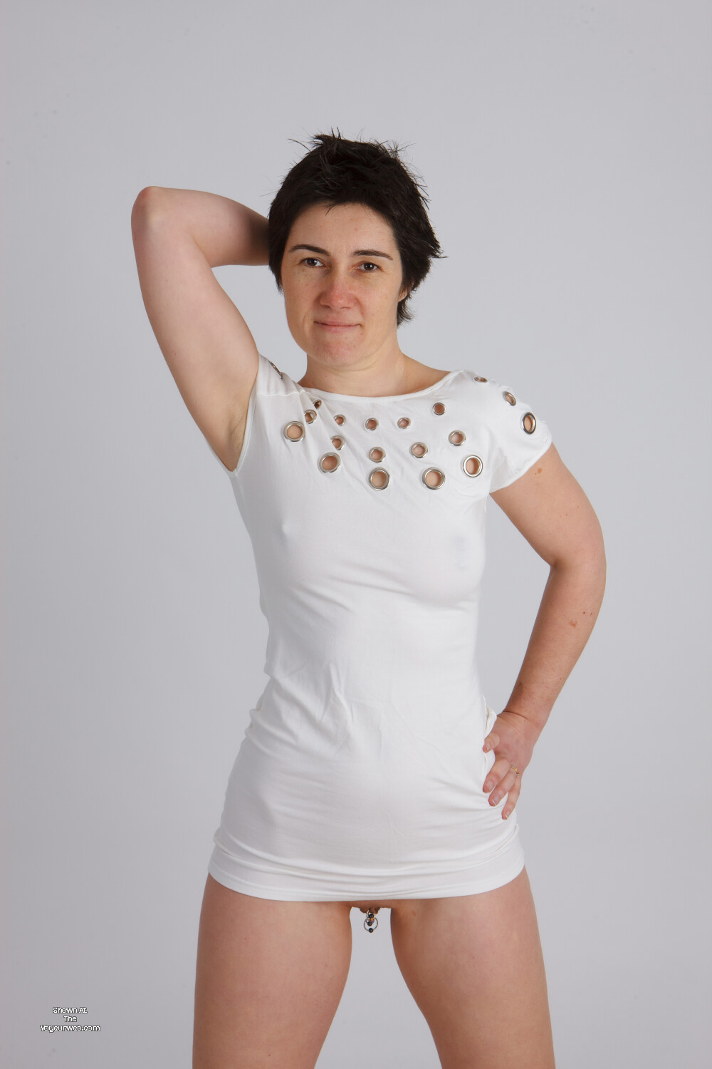 For those of you who follow my adventures you already know that I never ever wear a bra or underwear. If you are here for the first time I stopped wearing a bra or underwear some  years ago and dont regret it for a secondThis gallery shows me posing in a new white dress that gets a fair amount of glances when I wear it out as it is just long enough to be decent but if i raise my arms my rings become visible straight away. As you can see my ever erect nipples poke through the material and it's very obvious I'm braless. I also have lots of fun taking it off too!